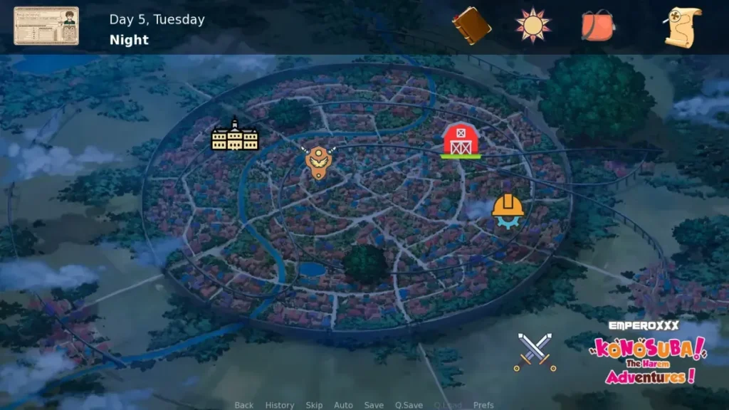 At its heart, the core loop of KonoSuba – The Harem Adventures is a satisfying cycle of exploration, questing, and bonding. Your days in Axel are spent juggling two main priorities: advancing the story and deepening your relationships with the iconic (and often troublesome) cast.
